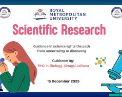 On December 15, 2025, a meeting dedicated to Students’ Scientific Research Activities was held at Royal Metropolitan University. It was organized by the Education Team under the leadership of Asel Saparova, Vice Rector for Scientific Affairs, and PhD Ainagul Jalilova, Head of the Department of Morphological and Fundamental Disciplines.